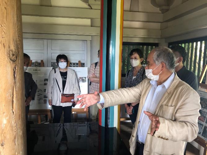 岐阜公園歴史博物館から徒歩5分ほどの所に三重塔があり、そちらを研修しました。通常建物内までは見学できないらしく通行不可の柵がしてありましたが、岐阜市役所の協力で建物の内まで見学をさせて頂きました。心柱が吊って浮いている1階部分しか見学することは出来ませんでしたが、心柱が浮いている所や心柱と周りの隙間が空いている所などは確認する事が出来ました。三重塔内で望月氏の説明や質疑応答まで対応頂け、四天柱が調査の結果5色で塗られていたので、当初の色を再現させた5色に塗られている事、また黄色部分だけ汚れているが、改修当時は綺麗な黄色だったが、黄色部だけ虫が花粉と間違えて寄ってきて汚すのではないかと面白い話も聞けました。