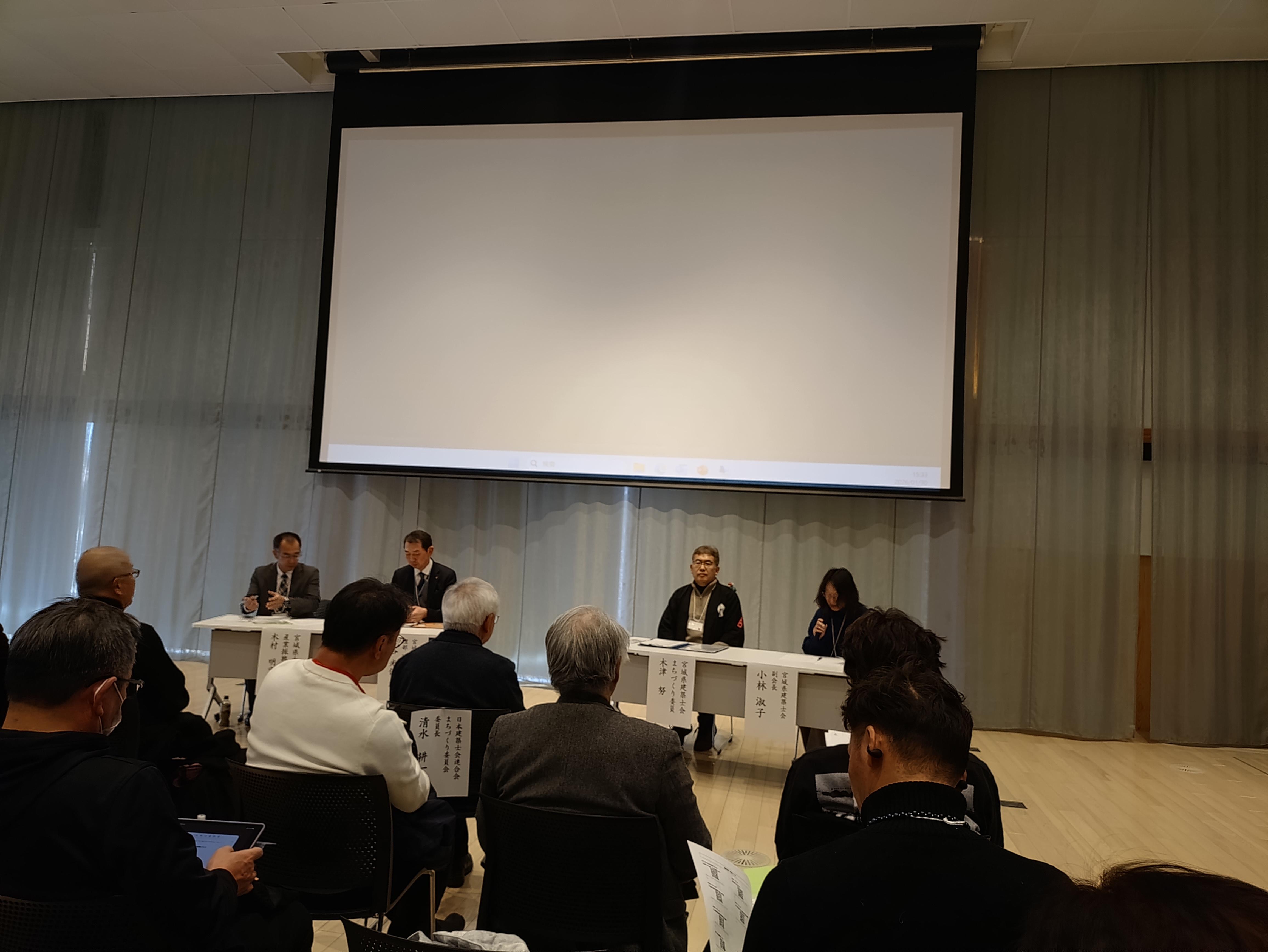 会議がはじまると、日本建築士会連合会 古谷誠章会長、宮城県建築士会 佐藤幸吉会長、日本建築士会連合会まちづくり委員会 清水耕一郎委員長の挨拶あと、講演1「女川町の復興まちづくり」として宮城県女川町役場 産業振興課 参事 木村明宏氏、講演2「巨大地震・津波の被害想定と必要な備え・行動」として宮城県 復興・危機管理部 防災推進課長 横谷光俊氏、パネルディスカッションと続きました。