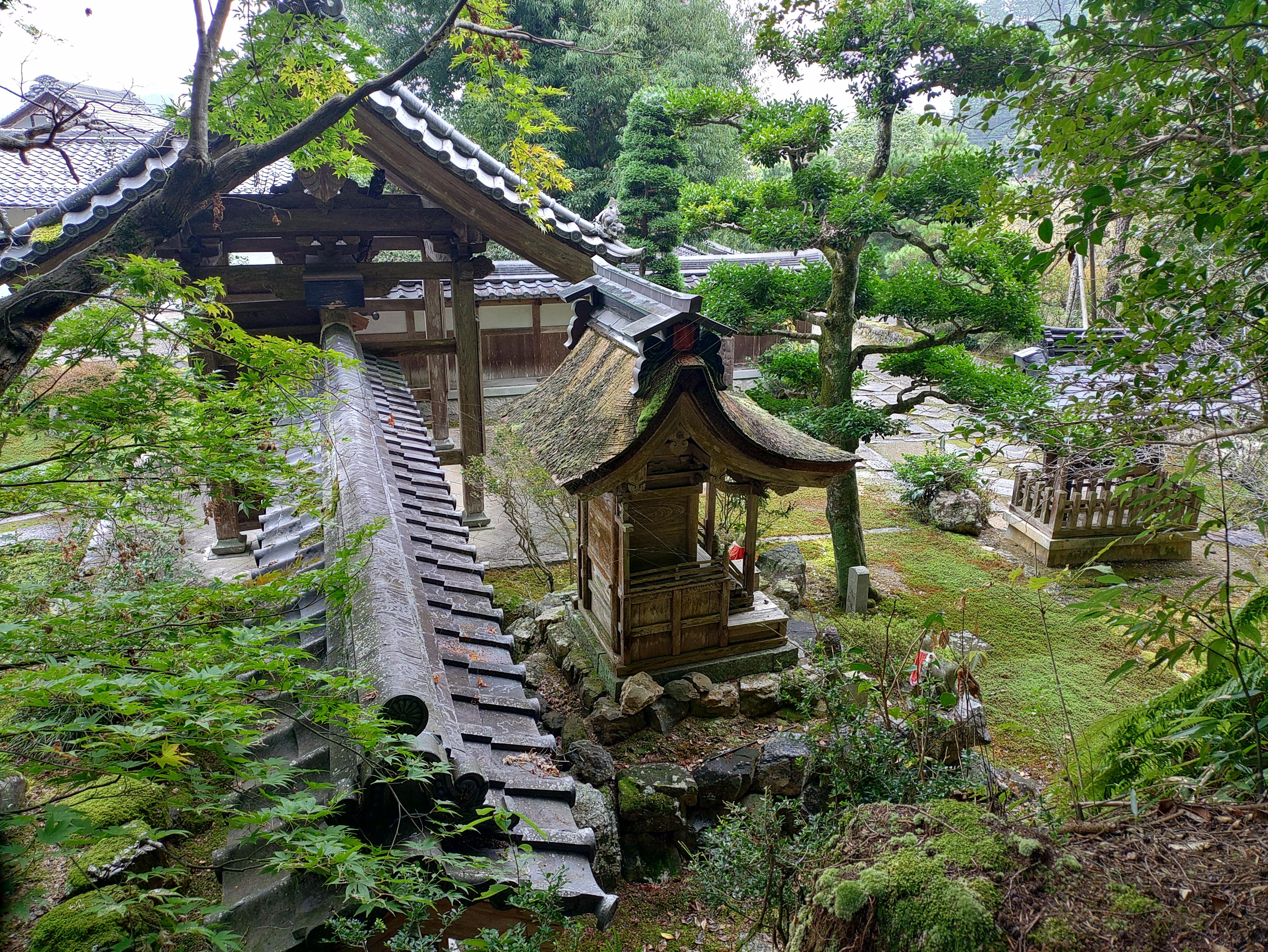 霧雨の中東光寺境内へユネスコ無形文化遺産に登録された「檜皮葺」の材料となる檜皮を採取する原皮師(もとかわし)の作業を見学できるということで行ってきました。先に境内を見たいと思い、集合時間より45分早く現地を訪れました。本堂は見事な檜皮葺でした。他にも何棟かありましたが、瓦屋根と檜皮葺の建物が混在していました。
