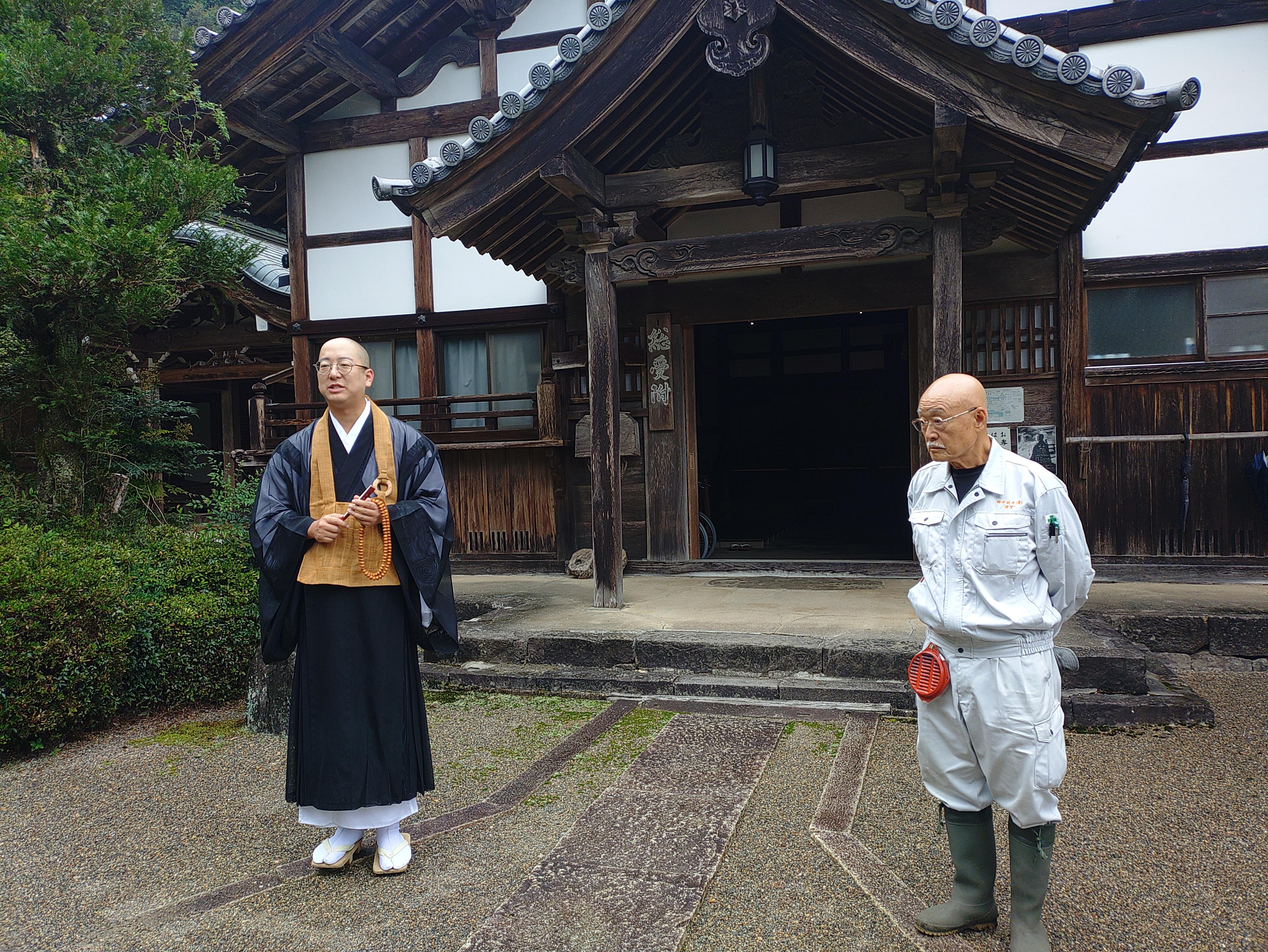 流れ造りの檜皮葺き 東光寺ご住職と原皮師の須賀氏
