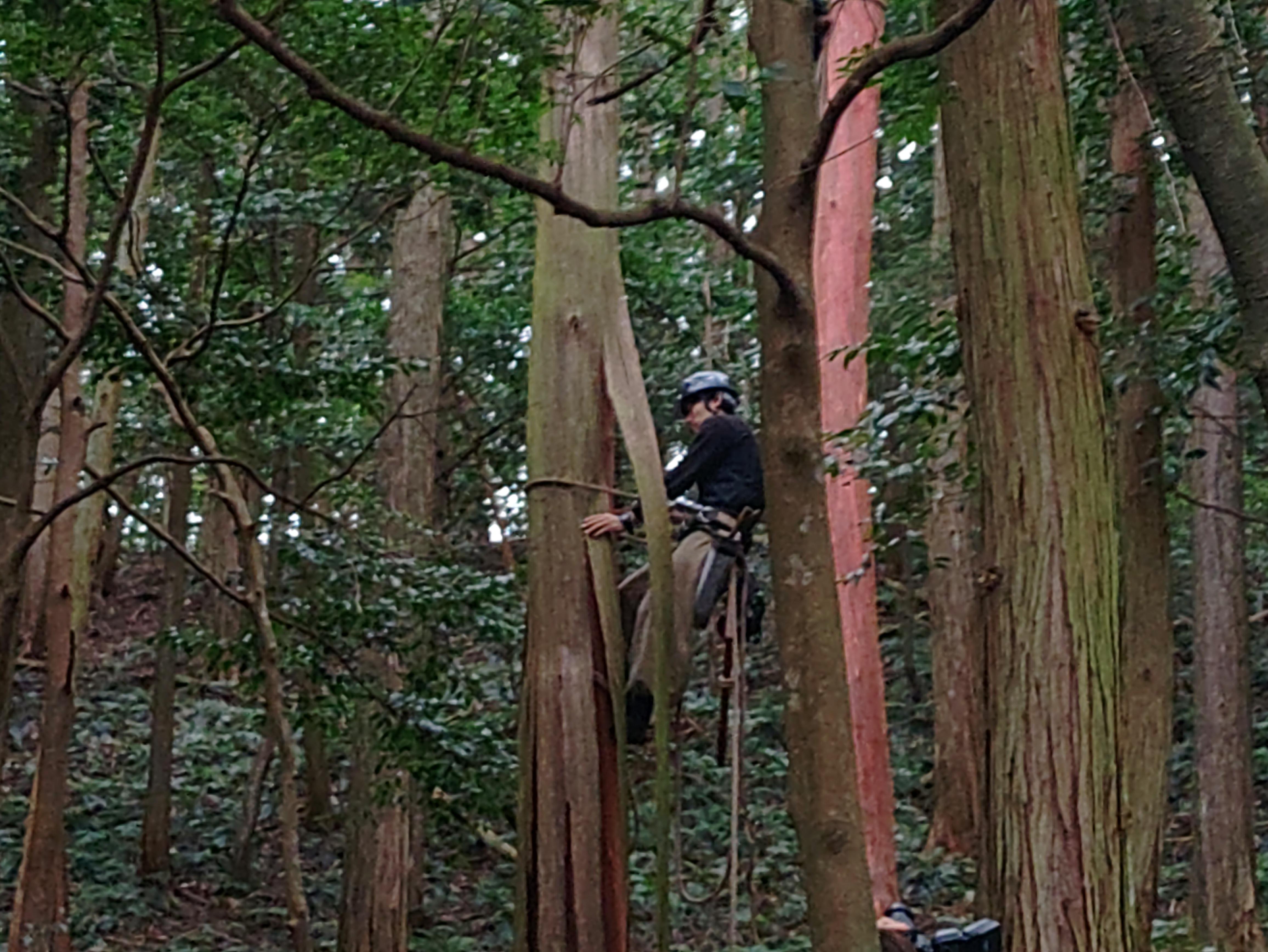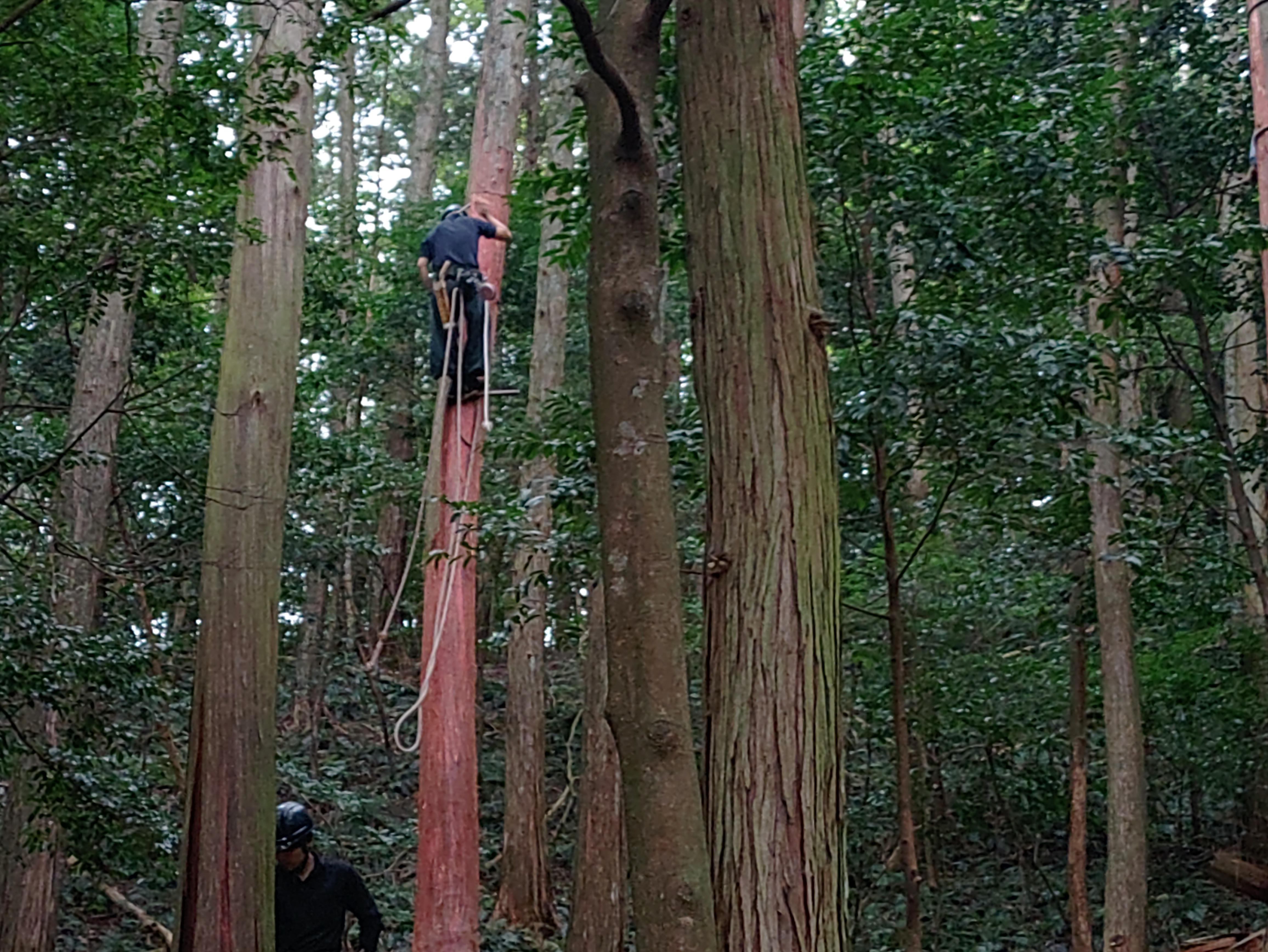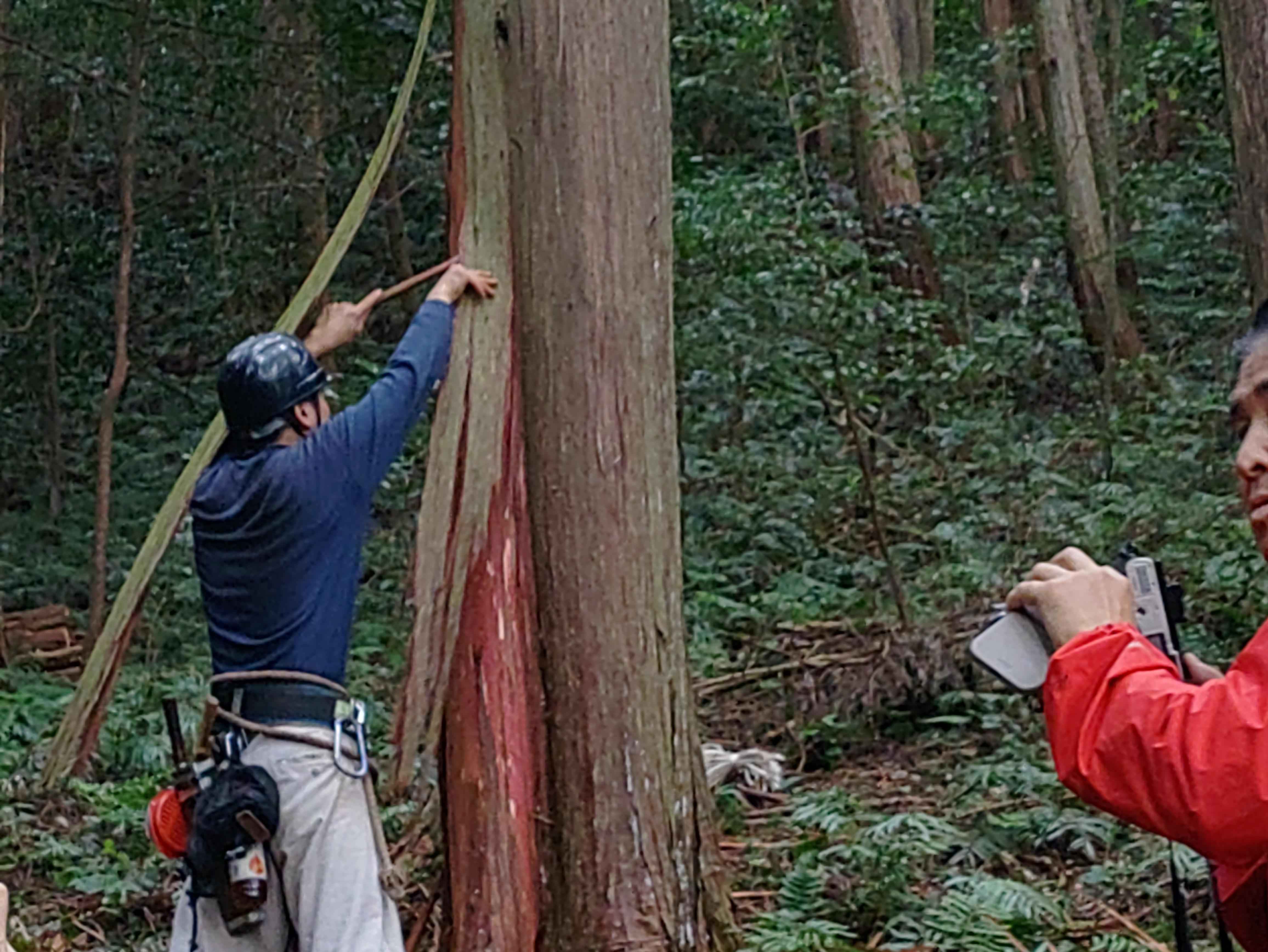 檜肌が見えている写真の一番手前の木はまだ1回も檜皮を採取されていない木となり、初めての檜皮が一番良いものだと思っていたが、一度採取されたもののほうが良い檜皮が採取できるそうです。4名の原皮師がいましたが、皆さん1度採取された木を選んでいました。また、須賀氏によると10回くらい採取された木もあるそうです。10年に1度となると100年という長い時間採取できることが分かりますが、次に行くと伐採されていることの方が残念ながら多いそうです。