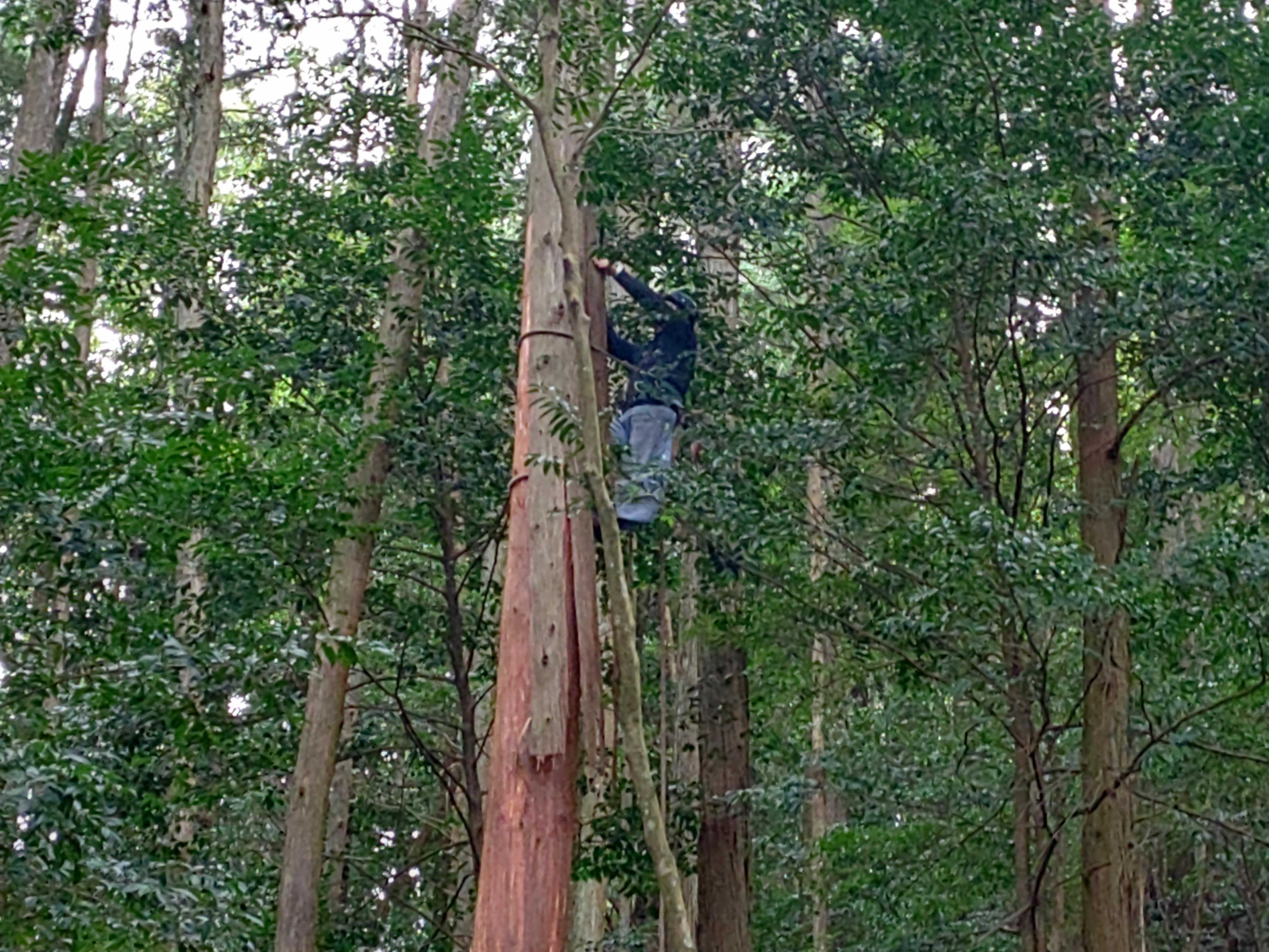 そういった説明を聞きつつ山の中へ移動しました。まだ姿は見えないところからパチンパチンと皮を採取する音が響いていました。