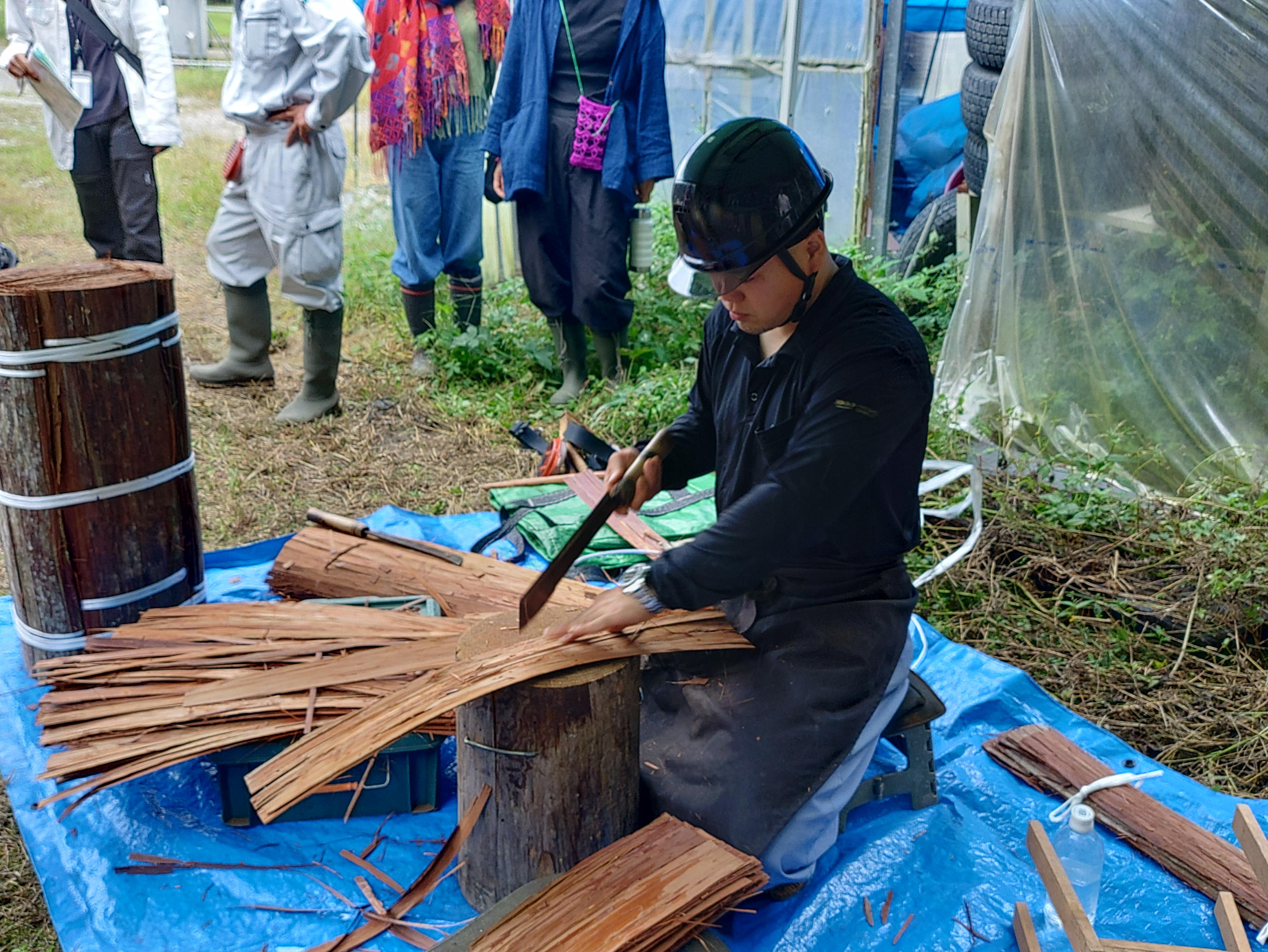 薄くした時に細長くなりますが、それをコヅク作業を経て長さ750㎜×小口150㎜×ケツ130㎜くらいで1枚の葺き材(薄くする作業の写真の板の大きさ)となります。それを写真左側のように束ねて乾かすそうです。重さは30キロにもなるそうです。コヅク作業は刃物先で叩くだけですが、それだけできれいにくっついていくのは見事でした。コヅクの漢字はの質問もありましたが、口伝えで字は分からないというところが職人の世界だなと実感しました。
