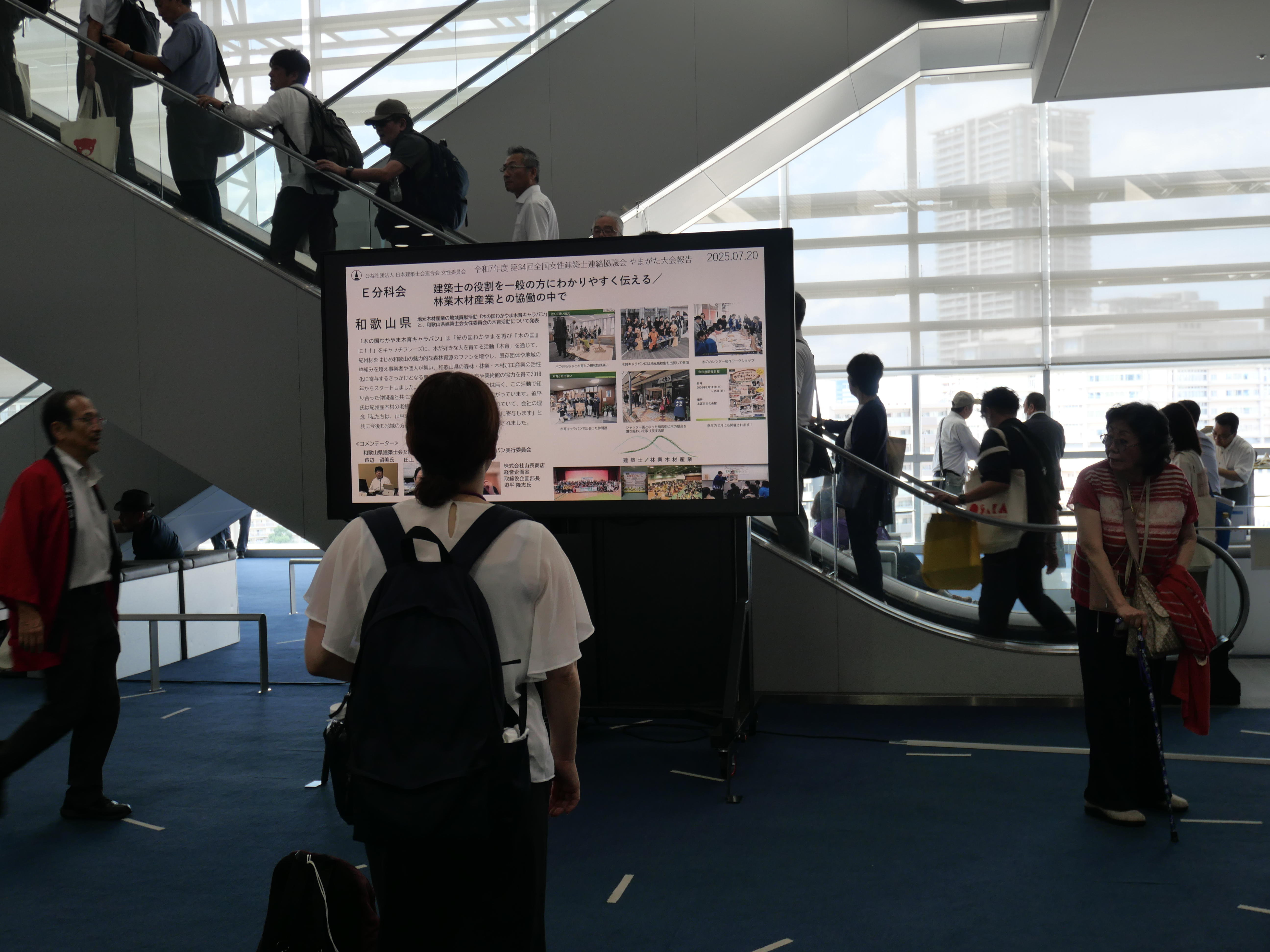 5階のメインホール入り口では96インチモニターが2台設置されて、一台には、伝統的技能者の紹介、もう一台には、7月に行われた、「令和7年度第34回全国女性建築士連絡協議会(山形)大会」の報告がされていました。今まではパネルでの全建女報告でしたが今回はデジタルサイネージでの案内になっています。