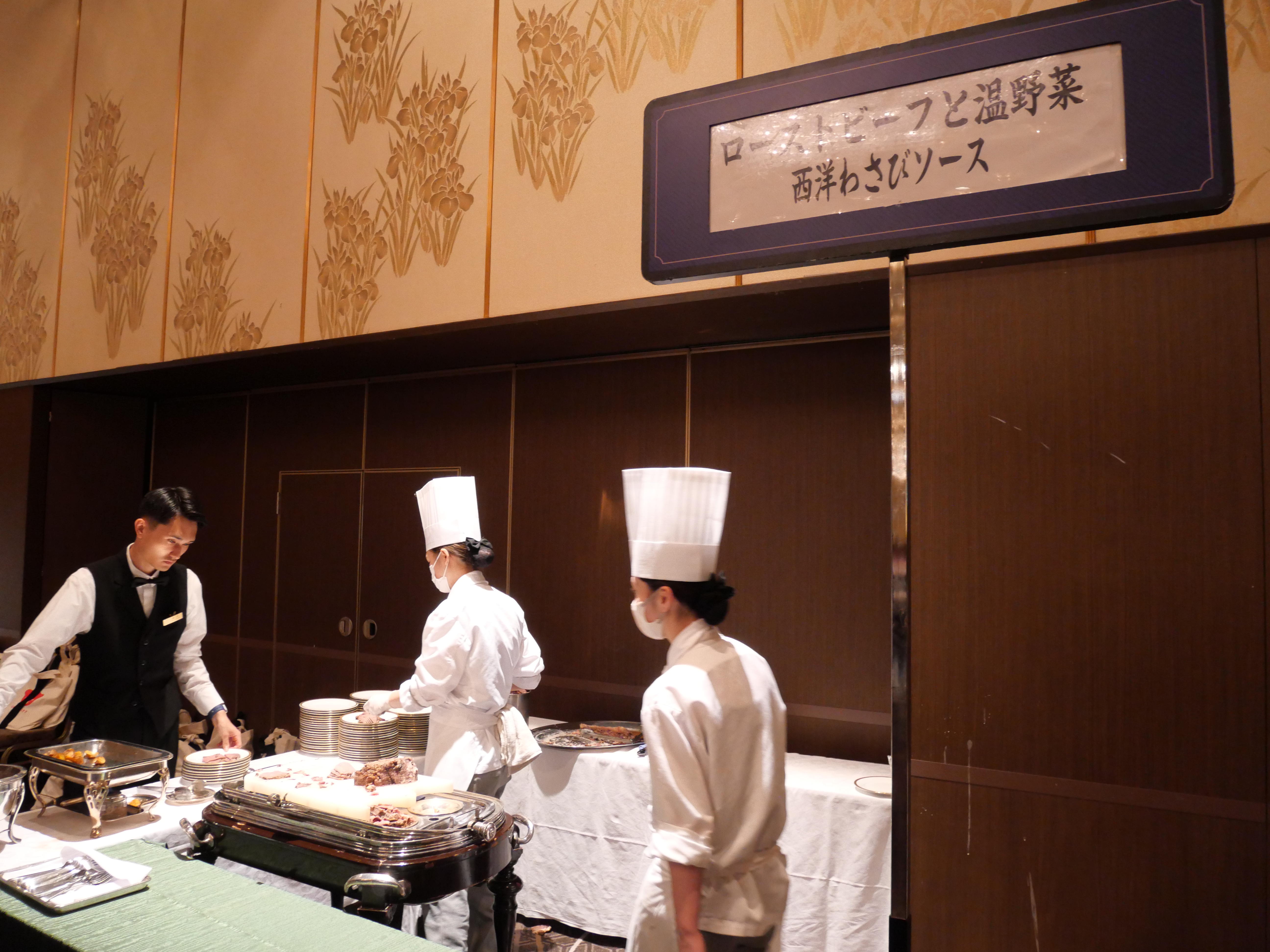 料理はビュッフェ形式で真ん中にあるもの以外に切りたてのローストビーフやラーメンは左右にあり皆さん並んで大盛況でした。