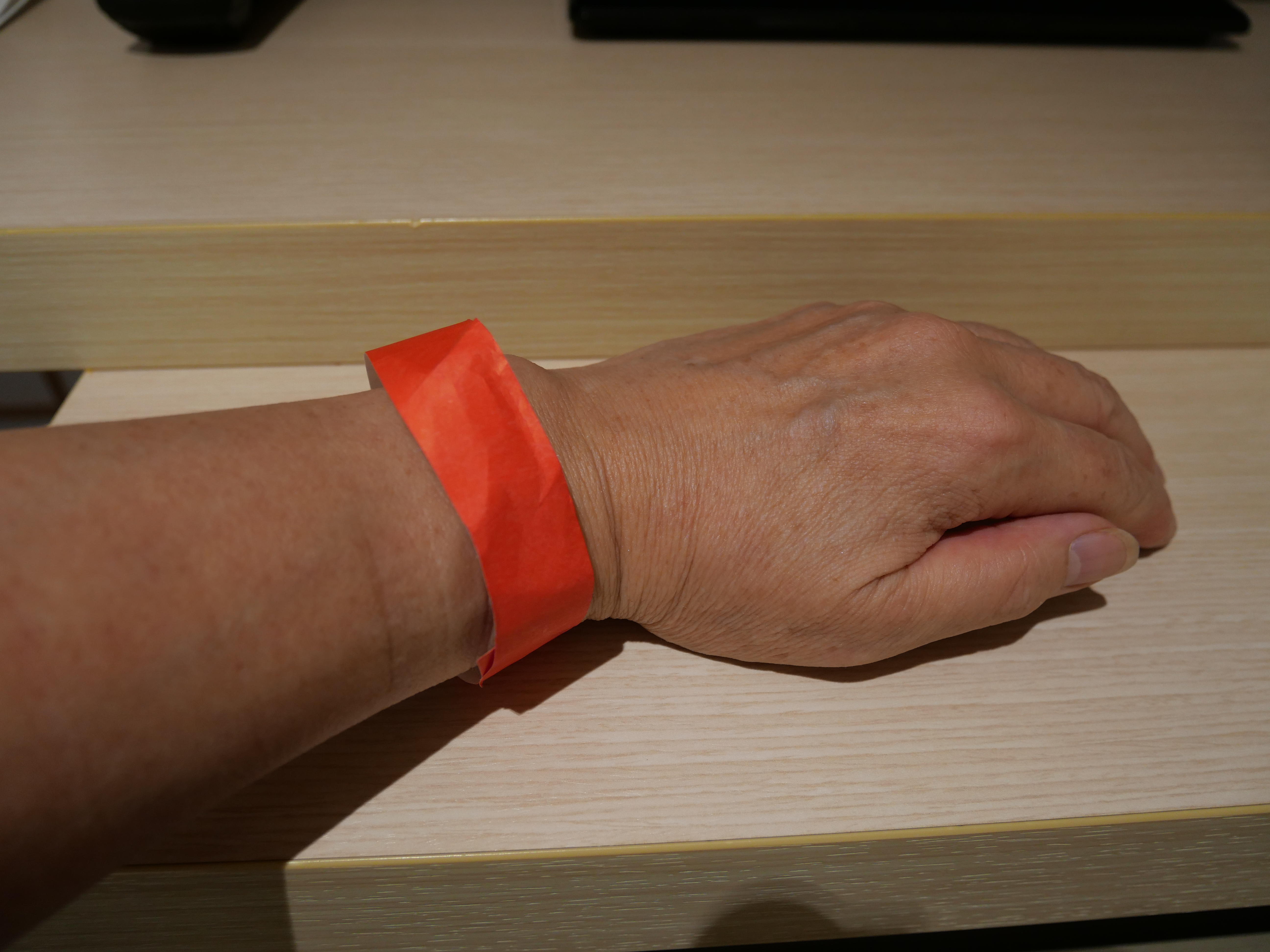 大交流会へは、大会受付の時にもらった、紙製のストラップを腕につけて入ります。