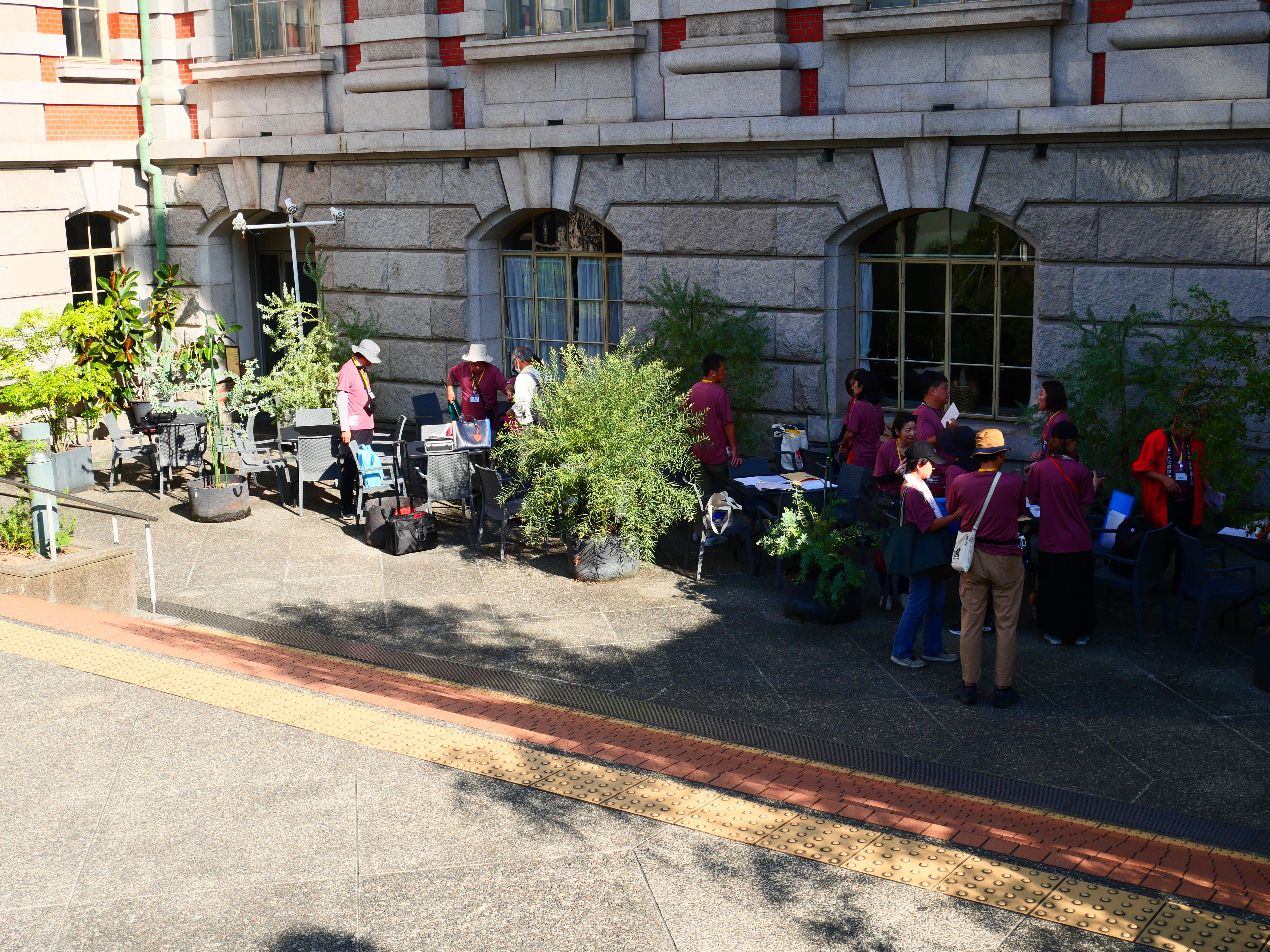 (↑ 大阪市中央公会堂前にて、大阪建築士会の係の皆さんの受付準備の様子)
