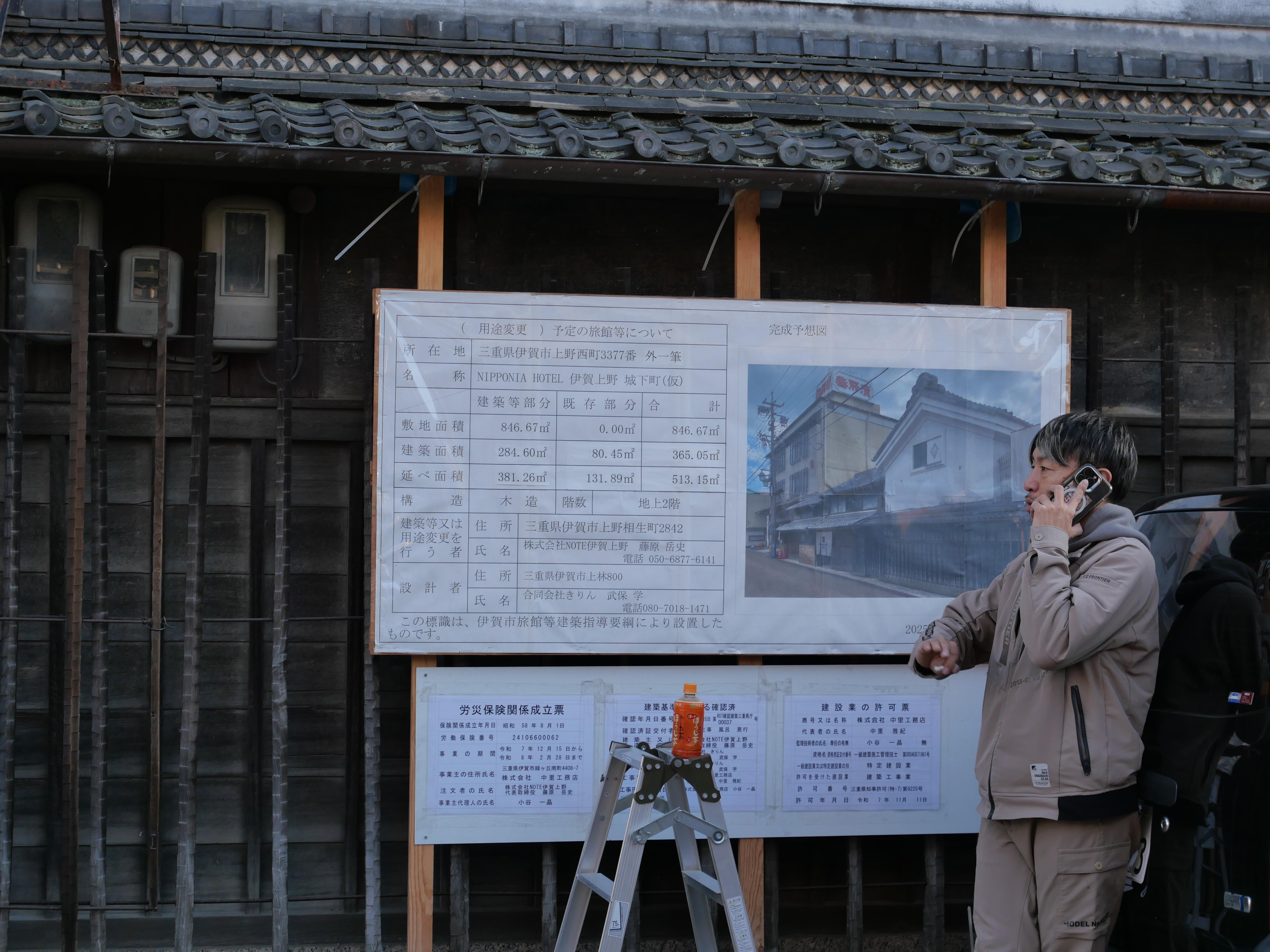 (↑ 分科会①にて、建物内部の2階ホテル廊下にて、伊賀市役所担当者に説明を受けている様子)