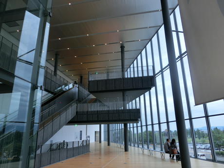 展示室以外は無料で入場でき、2階のホワイエからは晴れた日は立山連峰がきれいに見えるそうです。その連峰が平行になるように左右対称の建物ではなく斜めにしてあるそうです。